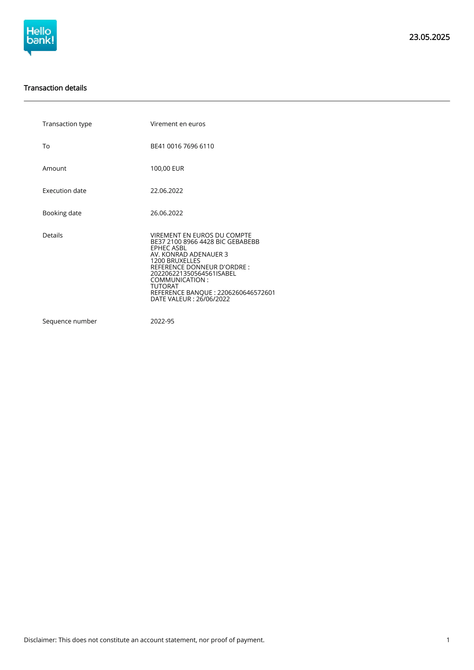Virement reçu de l'EPHEC pour les dix heures de tutorat.